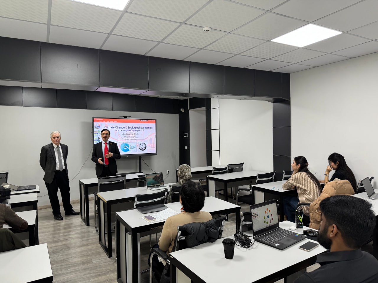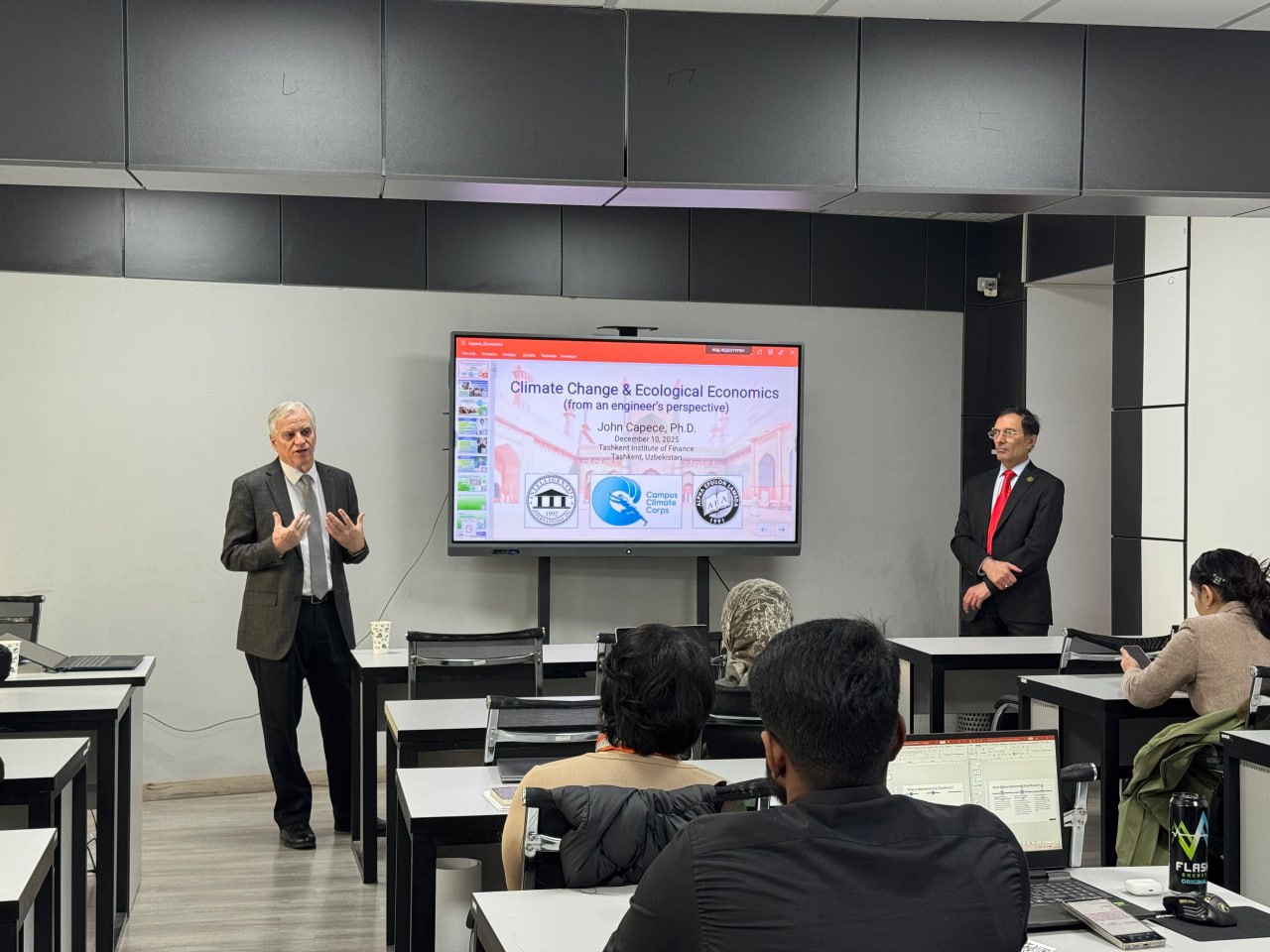 Tadbirga AQShning Florida universiteti professori, PhD., Alpha Epsilon Lambda tashkiloti ijrochi direktori John C. Capece ishtirok etib, talabalarga “Climate Change and Ecological Economics” mavzusida ma’ruza qildi va taqdimot o’tkazdi.